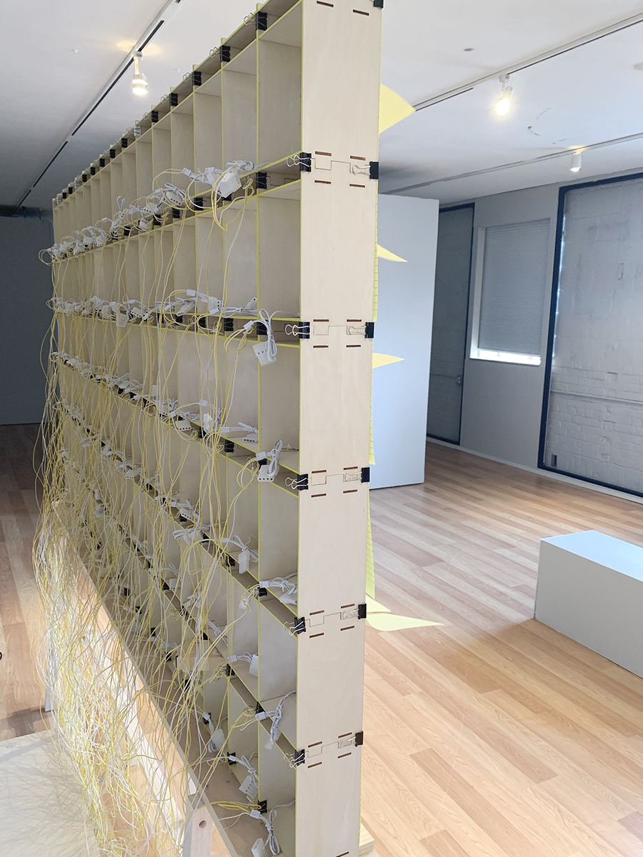 Breeze is a kinetic sculpture that explores natural and delicate movement using the materiality of papers and a digital system. It creates sequential and random movement patterns in a paper matrix using wind from computer cooling fans.